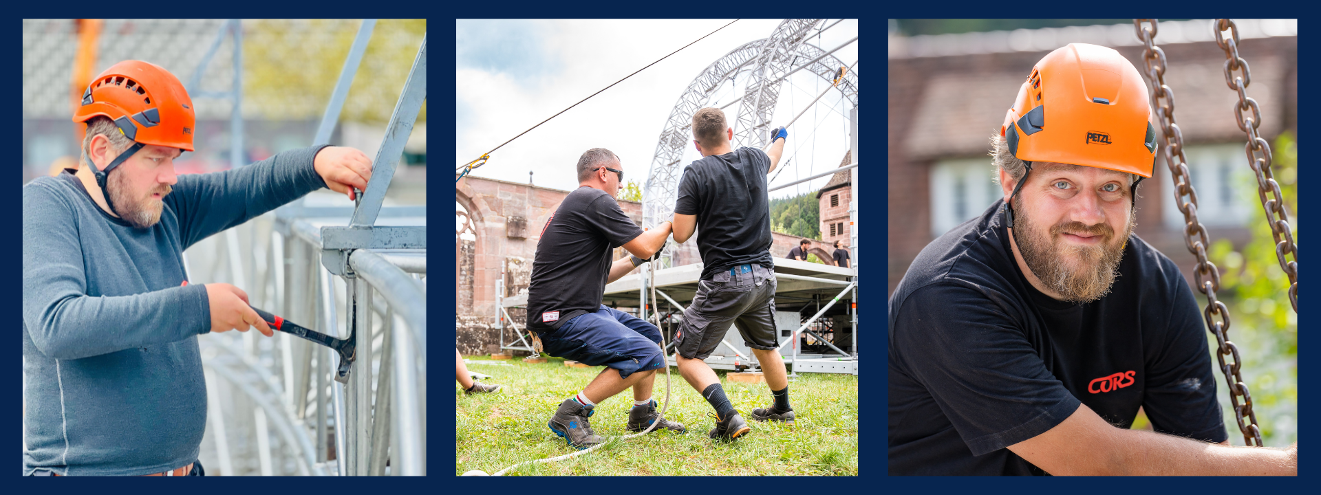 - Auf- und Abbau: Montage von Bühnengerüsten, Laufstegen und Tribünen